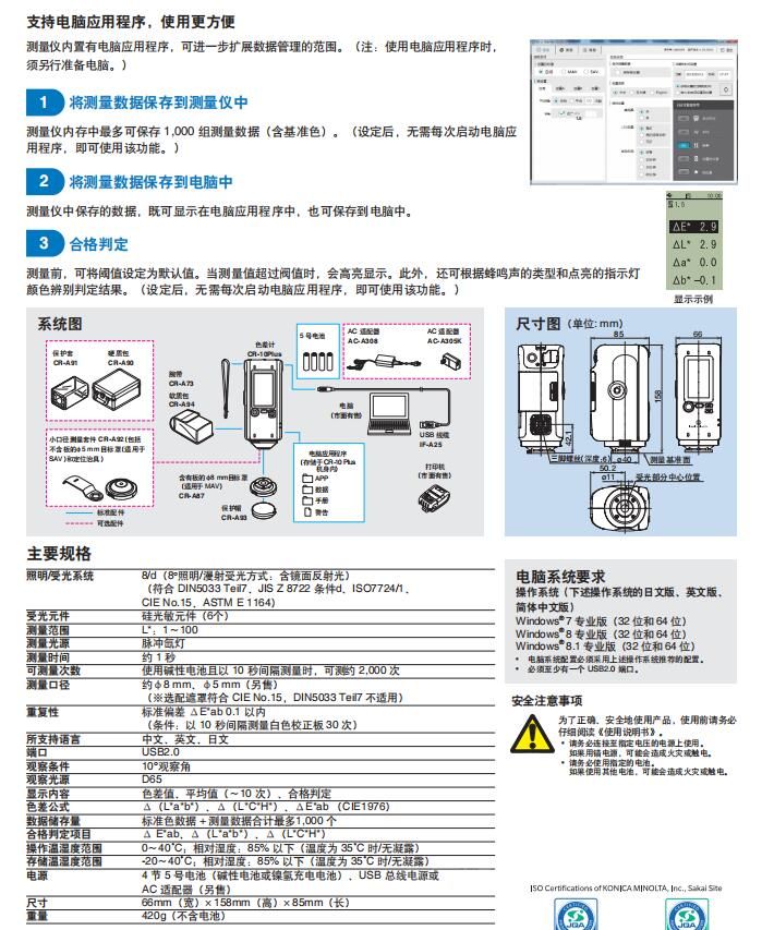 照明/受光系统 8/d(8°照明/漫射受光方式:含镜面反射光) (符合 DIN5033 Teil7、JIS Z 8722 条件d、ISO7724/1、CIE No.15、ASTM E 1164) 受光元件 硅光敏元件(6个) 测量范围 L*:1~100 测量光源 脉冲氙灯 测量时间 约 1 秒 可测量次数 使用碱性电池且以 10 秒间隔测量时,可测约 2,000 次 测量口径 约φ8 mm、φ5 mm(另售) (※选配遮罩符合 CIE No.15,DIN5033 Teil7 不适用) 重复性 标准偏差 ΔE*ab 0.1 以内 (条件:以 10 秒间隔测量白色校正板 30 次) 所支持语言 中文、英文、日文 端口 USB2.0 观察条件 10°观察角 观察光源 D65 显示内容 色差值、平均值(~10 次)、合格判定 色差公式 Δ(L*a*b*)、Δ(L*C*H*)、ΔE*ab (CIE1976) 数据储存量 标准色数据 + 测量数据合计*多1,000 个 合格判定项目 Δ E*ab、Δ(L*a*b*)、Δ(L*C*H*) 操作温湿度范围 0~40°C;相对湿度:85% 以下(温度为 35°C 时/无凝露) 存储温湿度范围 -20~40°C;相对湿度:85% 以下(温度为 35°C 时/无凝露) 电源 4 节 5 号电池(碱性电池或镍氢充电电池)、USB 总线电源或AC 适配器(另售) 尺寸 66mm(宽)× 158mm(高)× 85mm(长) 重量 420g(不含电池) -